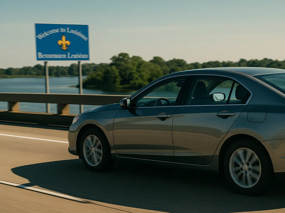 car driving across bridge louisiana welcome sign background