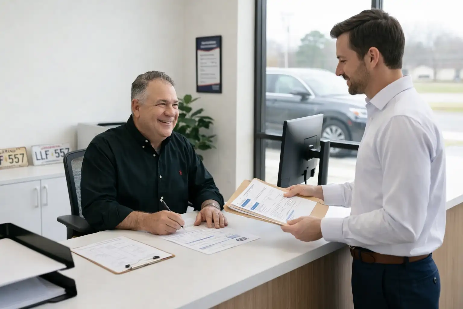 louis dutel title authority covington out of state title transfer customer signing paperwork at service desk
